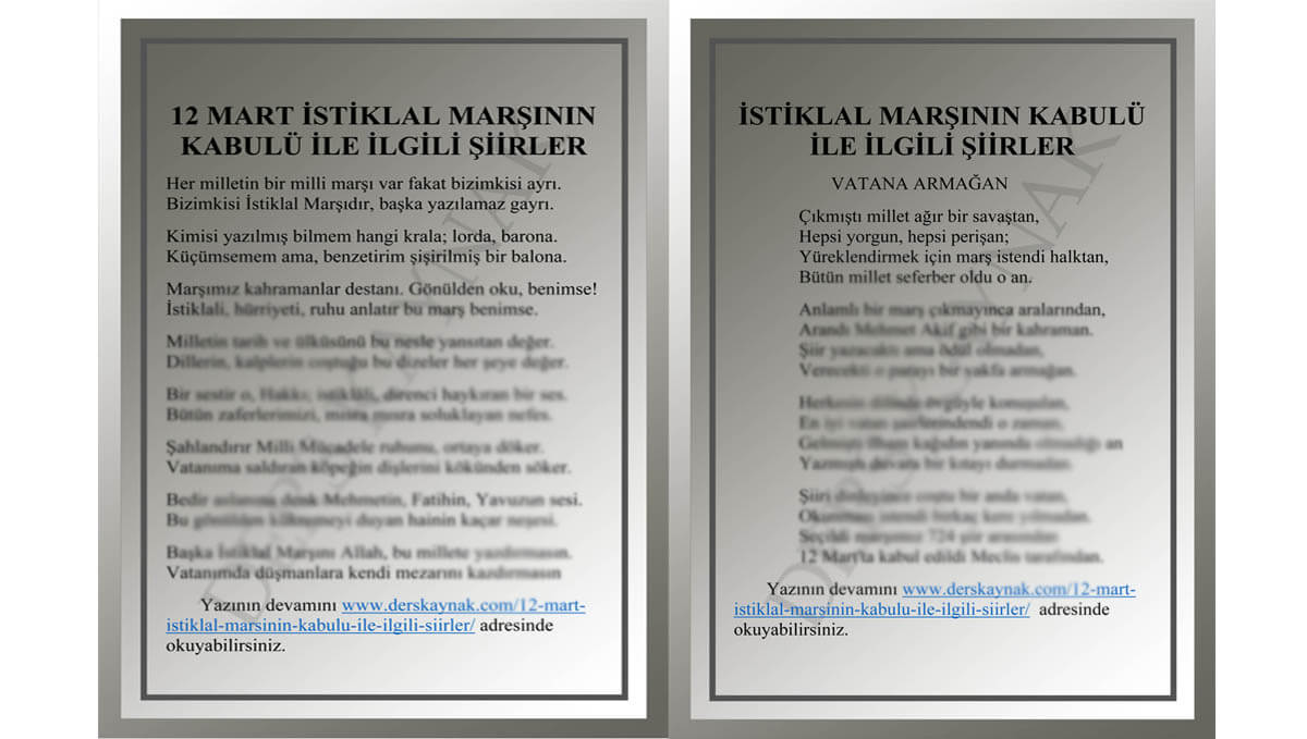 6 adet özgün şiir örneklerinden sonra, İstiklal Marşımız hakkında ünlü şairlerin yazdığı 10 şiir örneğini yazdık. Toplam 15 farklı şiir örneği paylaştık. 10 ünlü İstiklal Marşı şiir içinde Cahit Sıtkı Tarancı, Uğur Altay, Ali Ulvi Kurucu, Atila Çakıroğlu gibi önemli şairlerin yazısı bulunmaktadır.